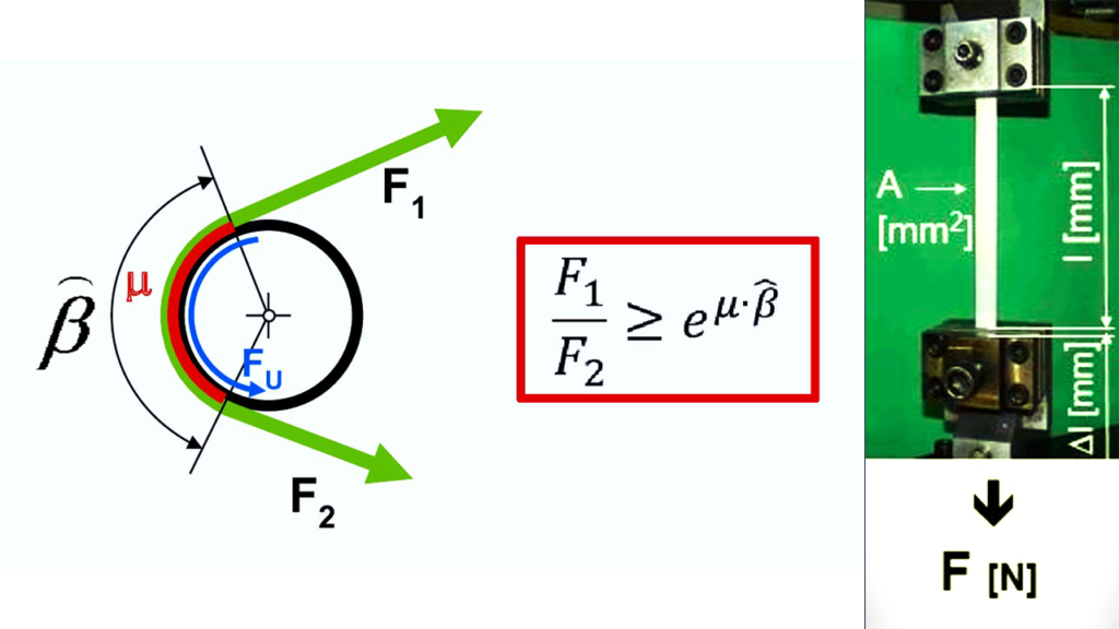 Testes de laboratório para verificação de alongamento e carga de ruptura, de coeficiente de atrito estático e dinâmico para correias planas de transmissão e transporte